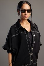 The black jacket-style shirt features a sharp collar and front button closure, combining the polish of a jacket with the ease of a shirt. The jacket shirt with 3/4 sleeves features soft draping and a relaxed fit for ease. Paired with matching jogger pants that feature an elastic waistband, side pockets, and tapered legs with a cuffed hem, creating a sleek yet sporty silhouette.