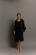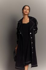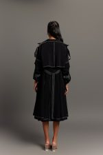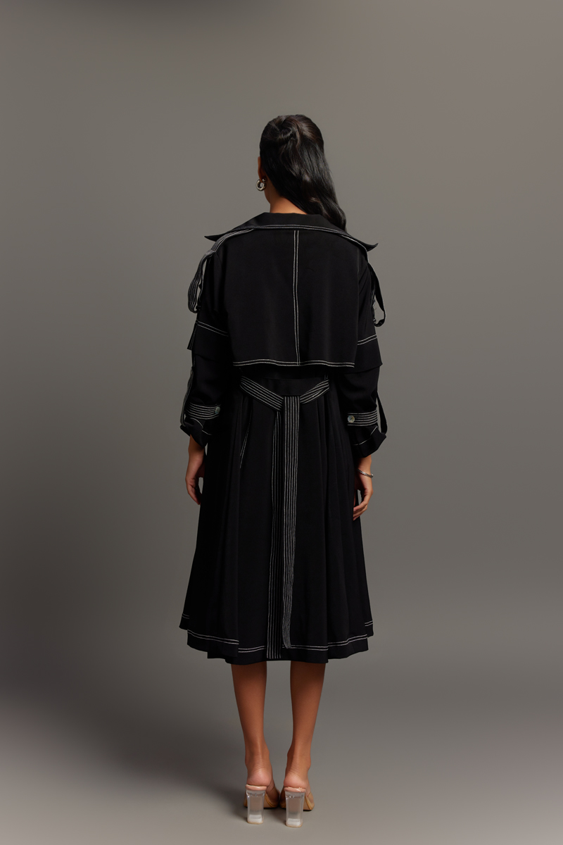 Elevate your elegance with this black trench dress, designed to blend timeless sophistication with effortless grace. It features a sleek elongated silhouette with a structured collar and clean, minimal lines for a refined contemporary look. A matching inner slip ensures comfortable coverage and a smooth base. A detailed belt enhances the graceful drape of the trench dress—perfect for polished day-to-evening wear.