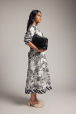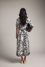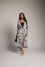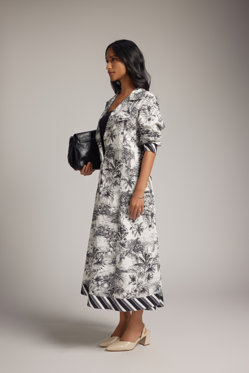 The trench features a sophisticated black & white porcelain-inspired print across a flattering silhouette. The fabric is wrinkle-resistant, non-clingy, and suitable for all-season wear. Finished with full-length sleeves and a buttoned down front, adding versatility & options for styling.