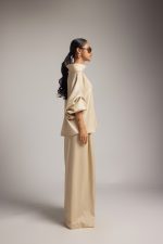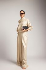 Paired with matching pleated palazzo pants with an elastic waistband and side pockets, this set blends modern glamour with effortless, all-day ease.