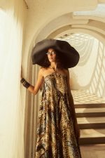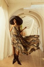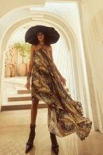 Asymmetrical dresses are captivating pieces that play with unconventional hemlines, adding a dynamic and modern twist to traditional design. The bold brown chain dress with a tie up at the neck is a stylish, full length, asymmetrical dress. If you’re looking for more definition, add a belt to accentuate your waistline.