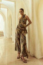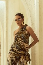 This Serpentique Print one shoulder top is a luxurious and bold fashion piece. A flattering and elegantly flowing outfit that delivers a relaxed and stylish look. The knotted top has an adjustable side tie up, paired with flowing pants.