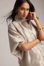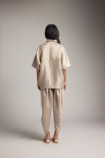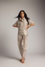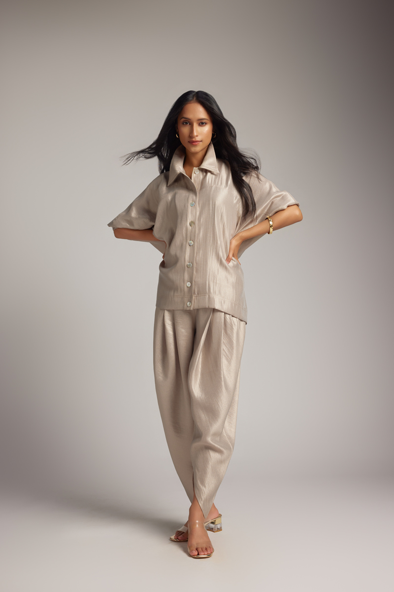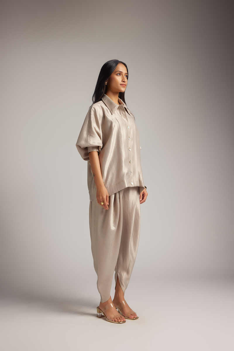 The jacket-style shirt features a sharp collar and front button closure, combining the polish of a jacket with the ease of a shirt. The jacket shirt with 3/4 sleeves features soft draping and a relaxed fit for ease. Paired with matching draped dhoti pants, the set brings graceful movement and distinctive style. The dhoti pant features a comfortable waistband and soft pleating.
