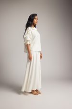 The white butter crepe cowl-neck top offers soft draping and a relaxed fit. The A-line skirt has an elastic waistband and graceful ankle length flow. The smooth fabric lends a soft elegance completing this polished, day-to-evening look.
