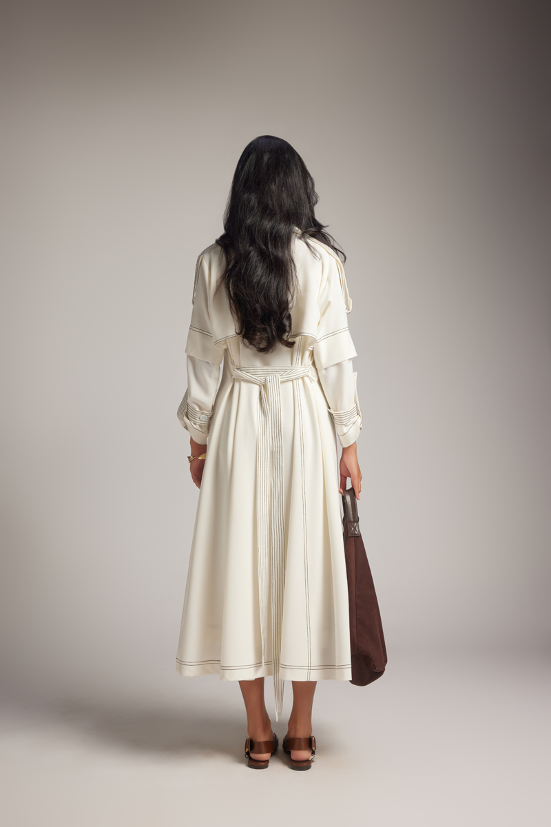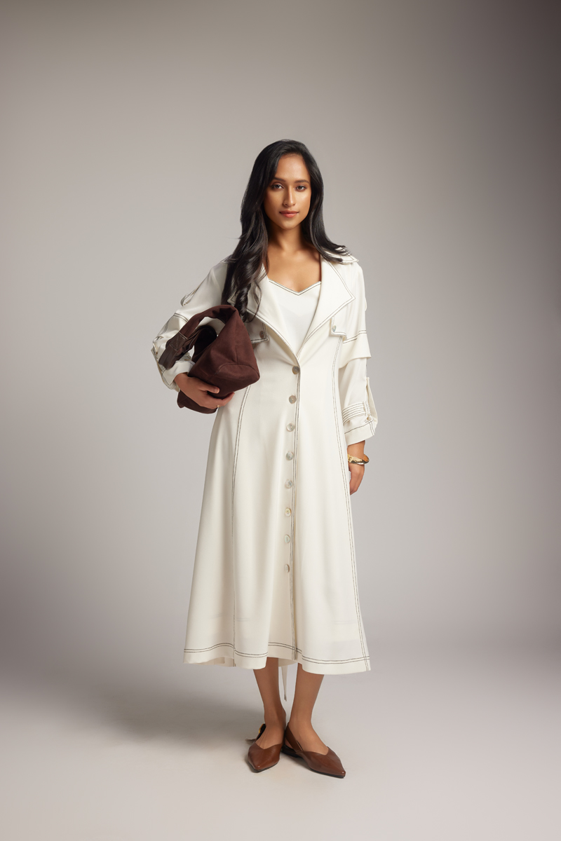 Elevate your elegance with this white trench, designed to blend timeless sophistication with effortless grace. It features a sleek elongated silhouette with a structured collar and clean, minimal lines for a refined contemporary look. A matching inner slip ensures comfortable coverage and a smooth base, the detailed belt enhances the graceful drape of the trench —perfect for polished day-to-evening wear.